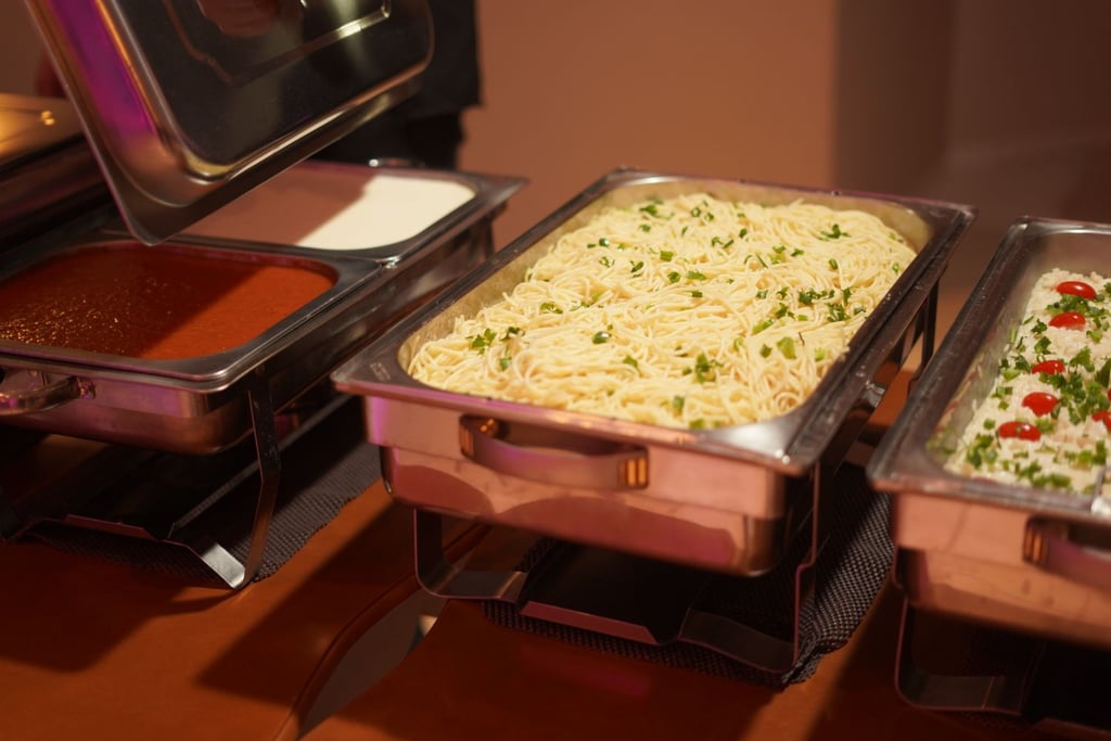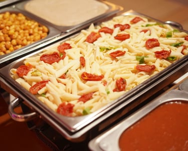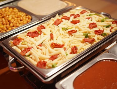 Refeição completa com entradas, pratos principais e acompanhamentos, ideal para qualquer tipo de evento.