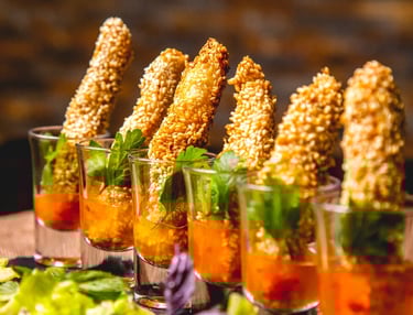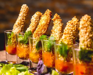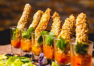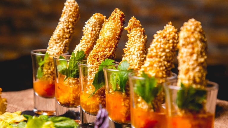 Porções individuais com sabores intensos e apresentação impecável para coquetéis e recepções elegantes.